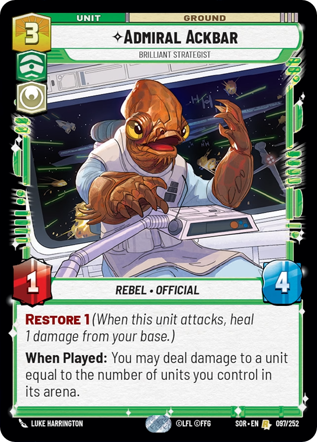 Tyler – Ackbar’s stats and the Restore ability are run-of-the-mill 2-cost value, so how useful he is depends on whether he consistently generates 3 or more damage with his ability. If it’s the latter, he’ll be a standby of Hero Green.