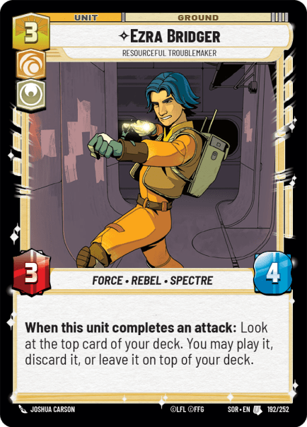 Tyler – In the Star Wars LCG, that Fantasy Flight made, the Spectre units circumvented color-spotting requirements. Since the designers seem pretty keen to lean on previous FFG designs, I’d be surprised if they didn’t so some of that with the Spectre team in this game. I like the design of this card in that Ezra encourages you to attack with him early to get the most out of the top-deck ability- apt for a youthful character!