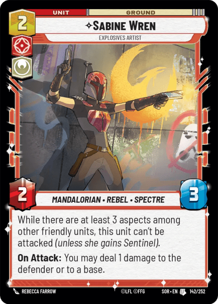 Justin – Ironically, the first deck I’m slotting this in… my Sabine/Yellow deck. Thank you FFG for weird unique rules that let me play all the Sabines! This is the ideal Aggro Round 1 drop, pumping out 3 damage from the get-go with the flexibility to cleanly take a 1-health unit off the board or pop a shield before swinging. Hero Red decks will certainly slot in 3 of these through the first couple sets.