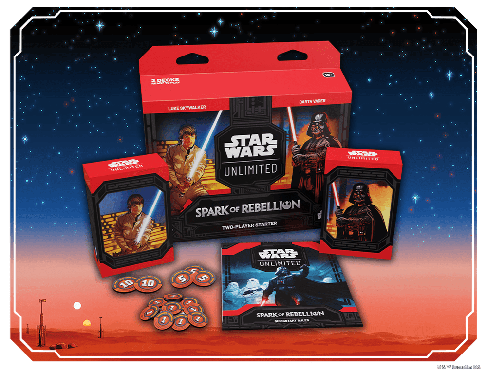 Next,we got the final piece of the puzzle for the 2-Player Starter- a price point of $34.99. That’s right around my previous guess in our article discussing what makes a good Starter Set! If you missed it, this box comes with two pre-built, 50-card decks that you can unpack and play right away, along with a plethora of damage counters, quickstart rules, 2 paper playmats, and 2 folded deckboxes. Important to note: there are 10 cards (including Vader/Luke leaders) that are only found in the Starter set, but the 8 cards that aren’t Leaders all include 3 copies for a playset. I’m a huge fan of only having to buy 1 FFG starter for once!