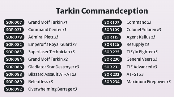 Against everything else, you’re really looking for a ramp card or two- then to build around that. Getting ahead on the resource curve against the mid-range decks let you get Tarkin out fast and build bigger units than they are able to play. As in most decks, Overwhelming Barrage can also just win games when played at the right time.