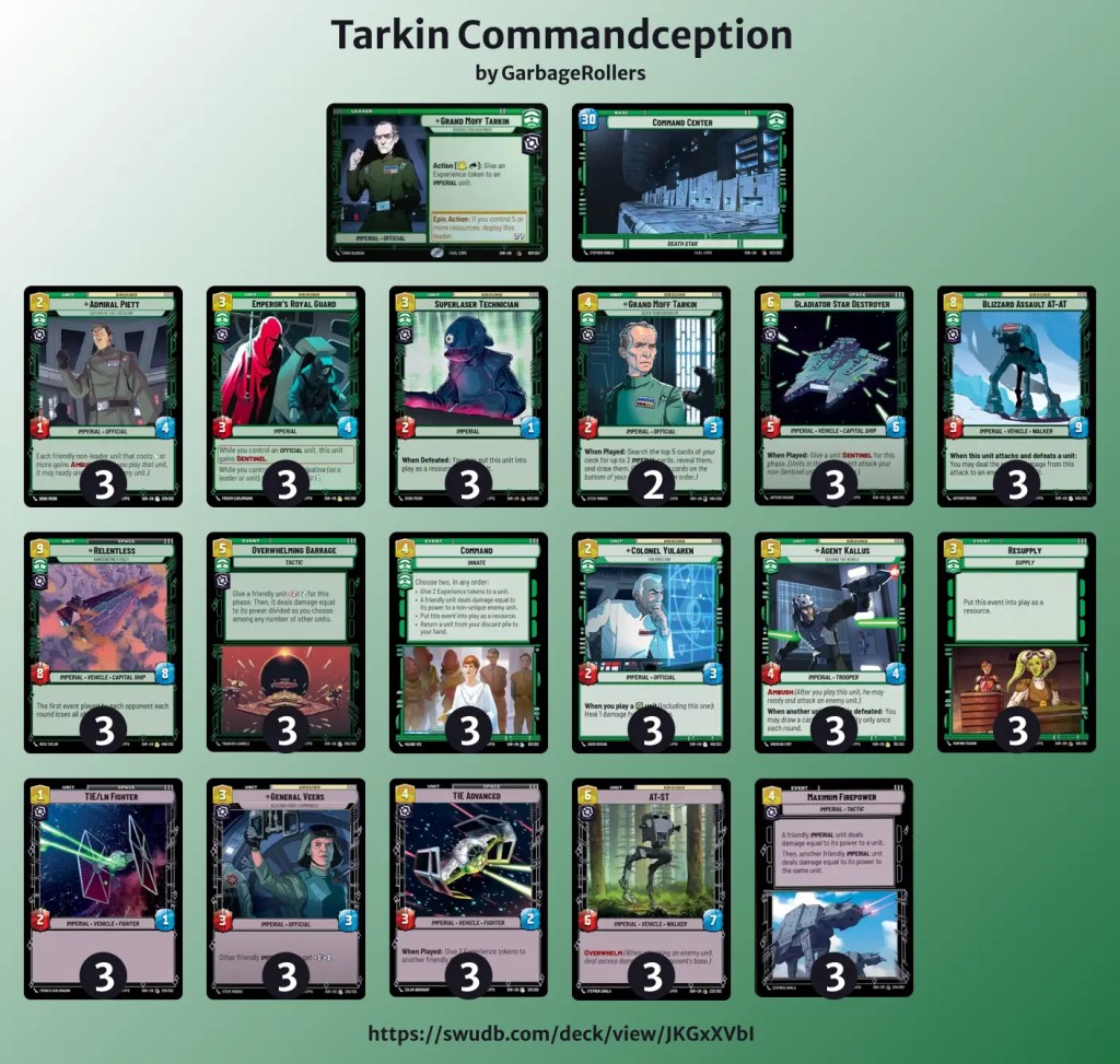 A Command within a Command…We finally saw the appeal of being able to pay 4 for Command and decided to give Mono Green a go! It’s a flexible deck that with Tarkin’s Leader ability that can still aggro some decks off the table. Most of the time, you’re trying to control the board and come down with your big hitters early thanks to the 9 Ramp cards in the deck. Also, check out the hot, new Deck image format SWUDB just launched!