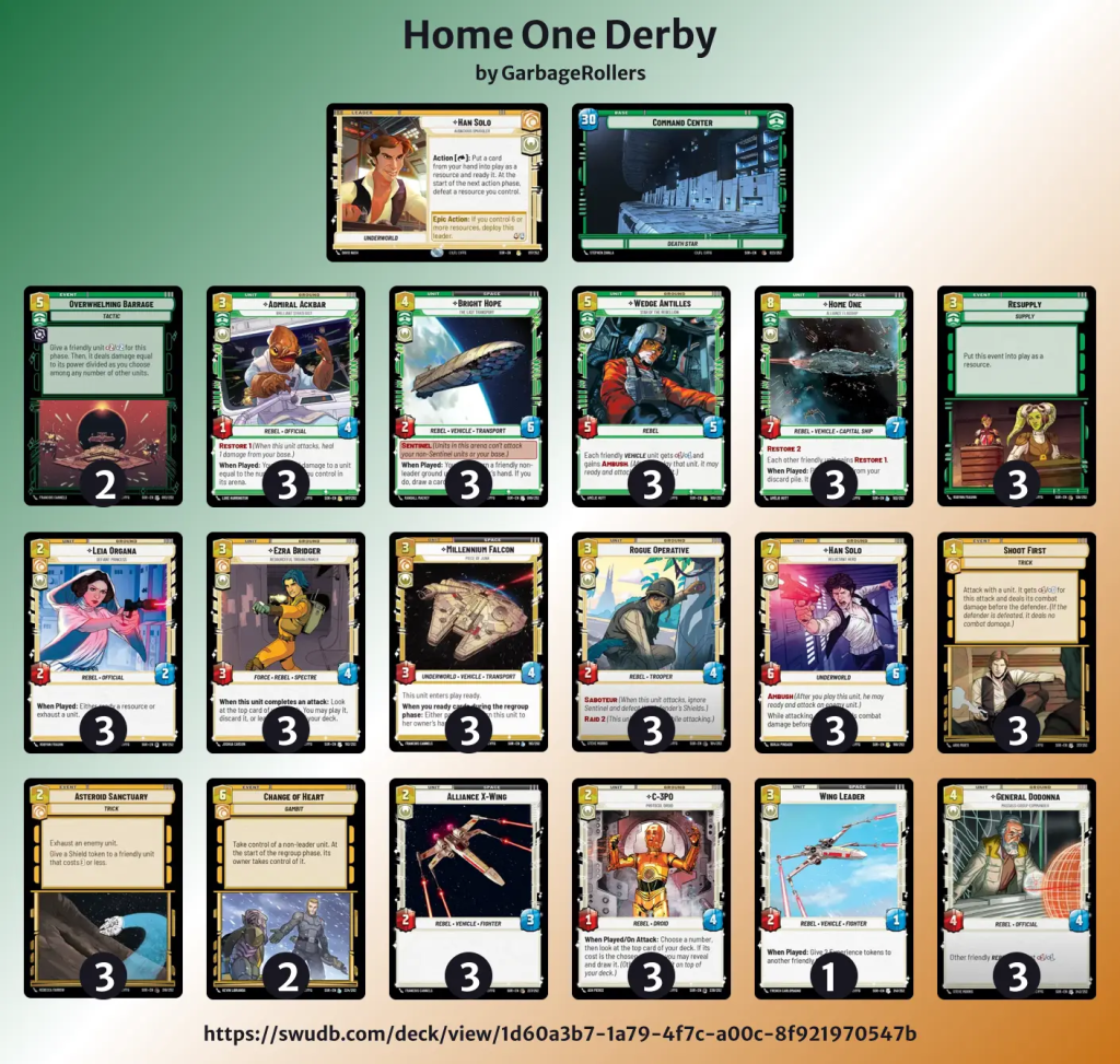 Welcome back! We first debuted this deck back in September and thanks to the cards revealed since then, it’s continued to evolve. The deck’s original hero, Leia, has been replaced by her beau, Han, and we’re ready to hit some home runs with Hero Yellow/Green again! Before we drive into the deck tech, THANK YOU to everyone on SWUDB who’s helped make this the most popular deck to date.