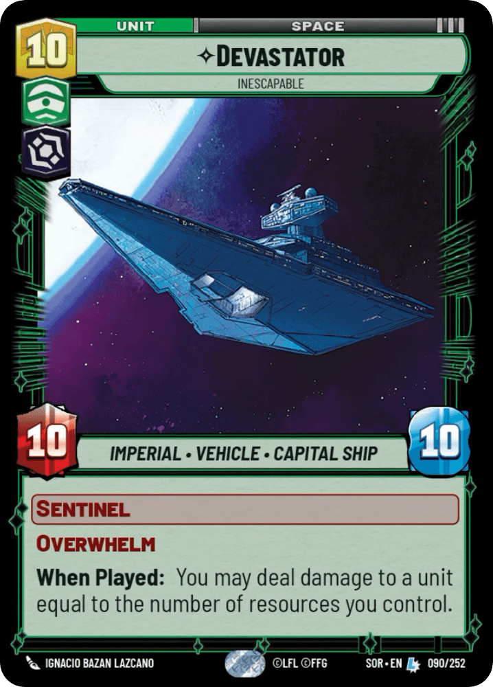 Tyler – This certainly checks all the boxes to be a playable bomb, but the questions was never going to be: “Is Devastator good enough?” It was always going to be: “Can we make it to 10 resources?” For now, I’m not sure the rampiest of ramp decks, Tarkin Green, has the tools to make it there. Aggro has proved very strong thus far… Finally, a unit this big looks like an awfully tasty target for removal from Waylay to Vanquish.