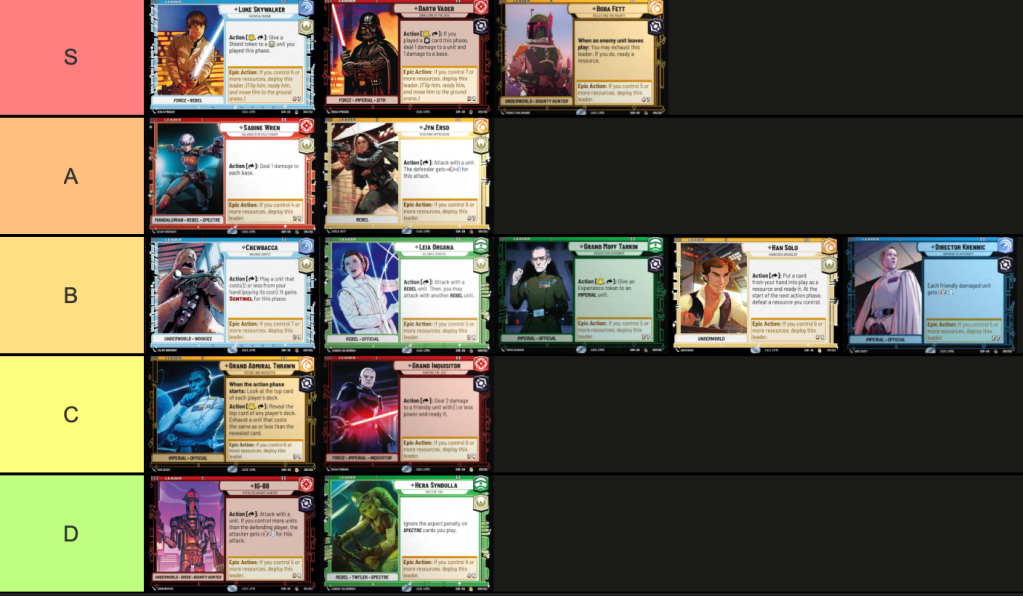 These are the general things I’m looking for, and I tend to evaluate them holistically, instead of thinking of the Leader side and the unit side as two separate halves. This is the lens through which I settled on my guess at a tier list. Let’s take it one letter at a time!