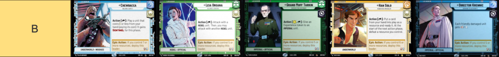 For Leia and Tarkin, that area is value. These are Leaders with really solid toolkits, but they won’t necessarily be able to use them every game in a resource-positive way. Leia’s ability sometimes just isn’t super relevant or doesn’t actually gain you the win or the initiative. Tarkin sometimes is forced to play on curve, and on top of that, 1 resource can occasionally feel kind of expensive for an EXP token. These Leaders have solid fundamentals, but may not always be directly contributing to their deck’s success.