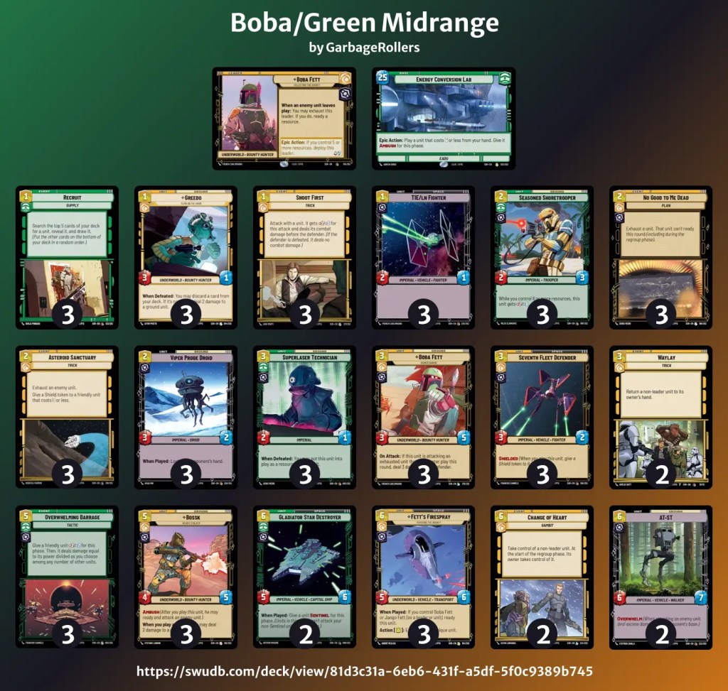 Building around these cards leaves us wanting a Villain Yellow/Green setup. From there we can choose between Grand Moff Tarkin or Boba Fett as our leader before we start to fill out the remaining cards to fit that dynamic. If we choose to run Boba, then we’re probably adding in another strong synergy card with him like Fett’s Firespray and complementing our deck from there.
