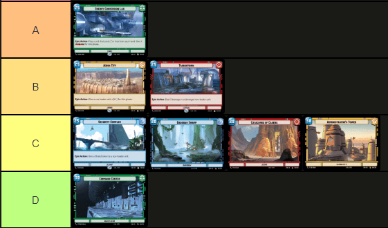 C tier – Security Complex finds its way to C tier with the other 30 hp bases that you can consider (not green). While a shield on a stick is a fairly strong, there are plenty of popular meta decks, like the Sabine and Leia aggro builds, that run lots of Saboteur units making this base effectively blank. For that reason, blue is the one color I think you will have to be cautious the most of when choosing Rare vs Common bases.