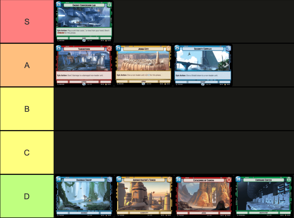 A tier – Tarkintown has really grown on me and I think it’s right behind ECL in terms of value. Jedha is probably the hardest of the rare bases to really maximize, but it’s especially clutch against opposing Sentinels and has the highest floor. Security Complex gets an unfair rap- shields are super strong and a free one is pretty great.