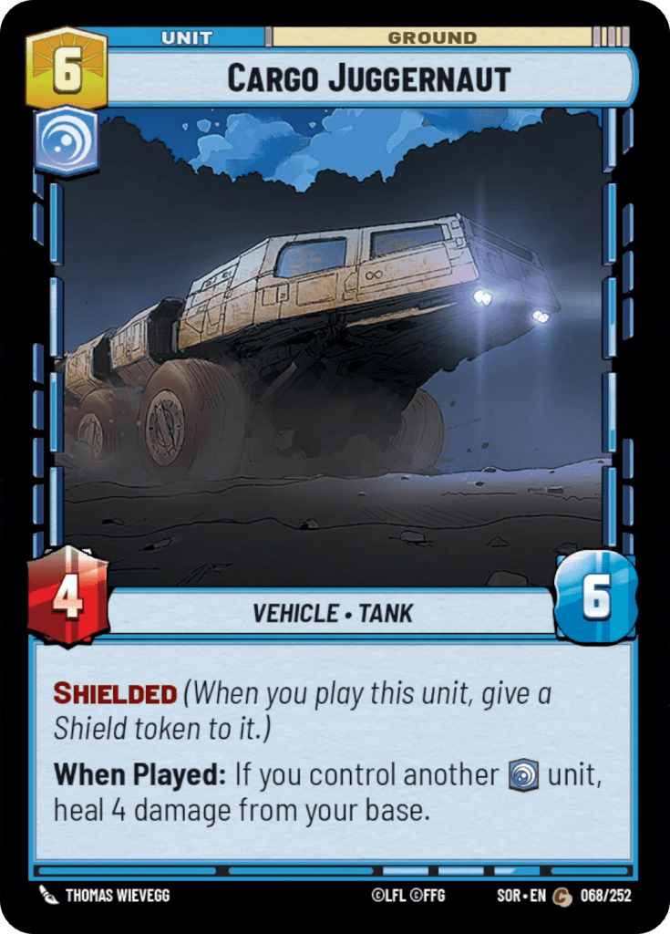 Tyler – There’s lots of hooks to combo with here: ECL, Admiral Piett or Wedge could all give this big boy ambush. Taking damage and then throwing the shield on top preserves Juggernaut’s value for later trades. I don’t have this vehicle slotted into a competitive deck yet, but the potential is there.