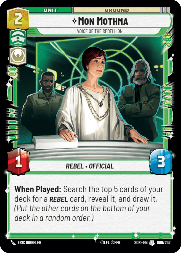 Justin – Looking at Grand Moff Tarkin as the comparison, we’re looking at 2 resources cheaper for 1 less power and 1 less card. Since that leaves Mon playable as a Round 1 drop, I suspect she will see a whole lot of play in Green as long as Rebel continues to be a strong trait in hero green.