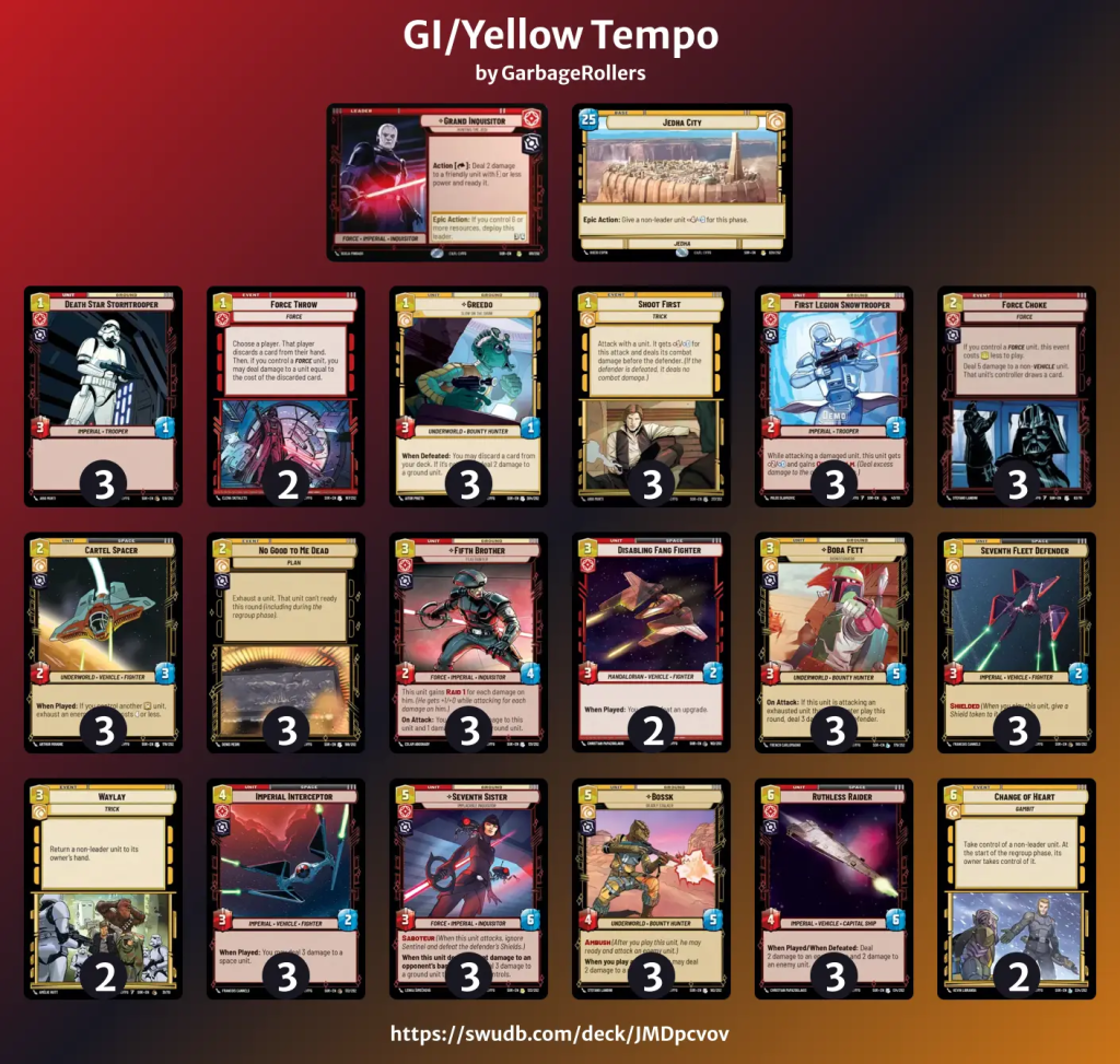 This deck is loaded with solid tempo plays. Shoot First can trade card and resources for board state even more efficiently than Force Choke. Imperial Interceptor is an amazing two-for-one boardstate swing. The Grand Inquisitor himself is even a form of tempo that allows you to trade unit health for extra attacks. Combined with cards like Fifth Brother and Seventh Sister, he can lead to favorable trades and an even better board.