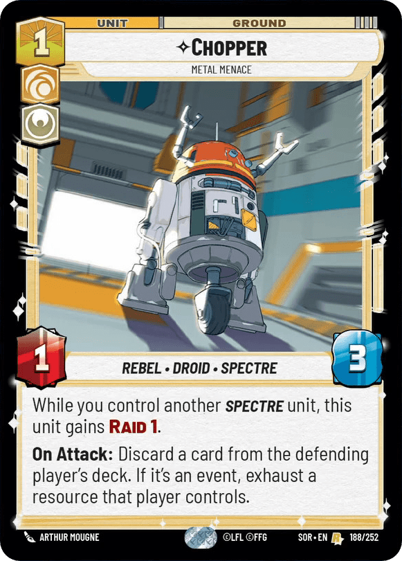 Justin – The “On Attack” could potentially cripple opponents, but most decks top out around 12 events, giving Chopper a sub 25% chance to hit. The highest-of-high Boba decks, running close to 20 events, still aren’t even a coin flip to hit. Given that you also need a Spectre unit in play, Chopper won’t always be a value machine. You’re happy to slot him in any Hera deck, but beyond that I’m not sure where he fits. Hero Yellow doesn’t see much play outside of Sabine aggro decks, but this isn’t the type of card you’re slotting in there. Chopper could gain more traction in a set or two!
