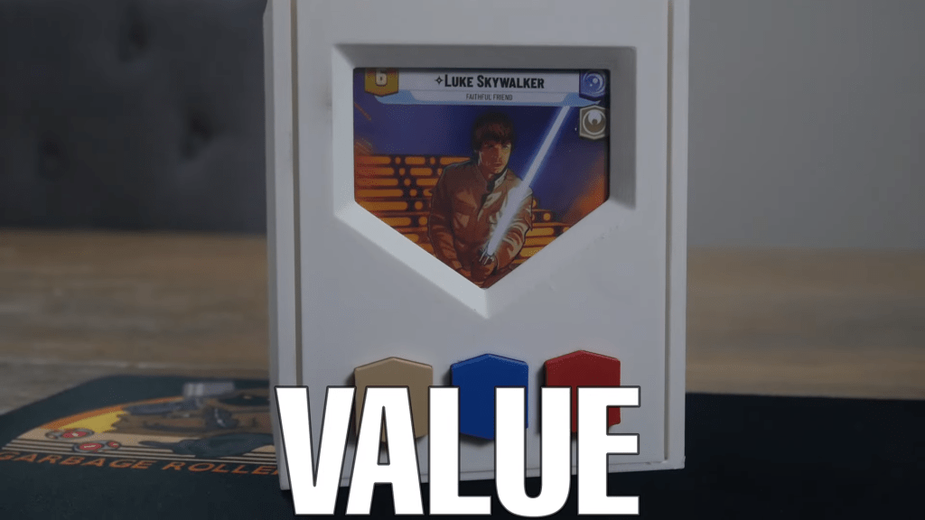 This is a deckbox I’d love to rock at a tournament. With the top window displaying my Leader and the 3 slots for my aspect tokens, it’s a really cool package! The tokens have good visual clarity, and the included initiative token has the thematic Jedi symbol. It’s not the translucent vibrant look you can get from acrylic tokens, but it still pops on the table pretty well.