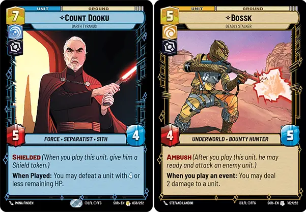 Overwhelming Barrage is a pretty obvious two-for-one or better. One a large enough unit it can kill multiple things, but if you play it into open resources your opponent might be able to kill the unit you targeted with OB and get that value back. I really like Bossk as a two-for-one, he can usually trade with something on his ambush attack and then either take out more cards with his direct damage trigger or our opponent will prioritize killing it, even at the cost of a card, to stop that trigger from popping off.