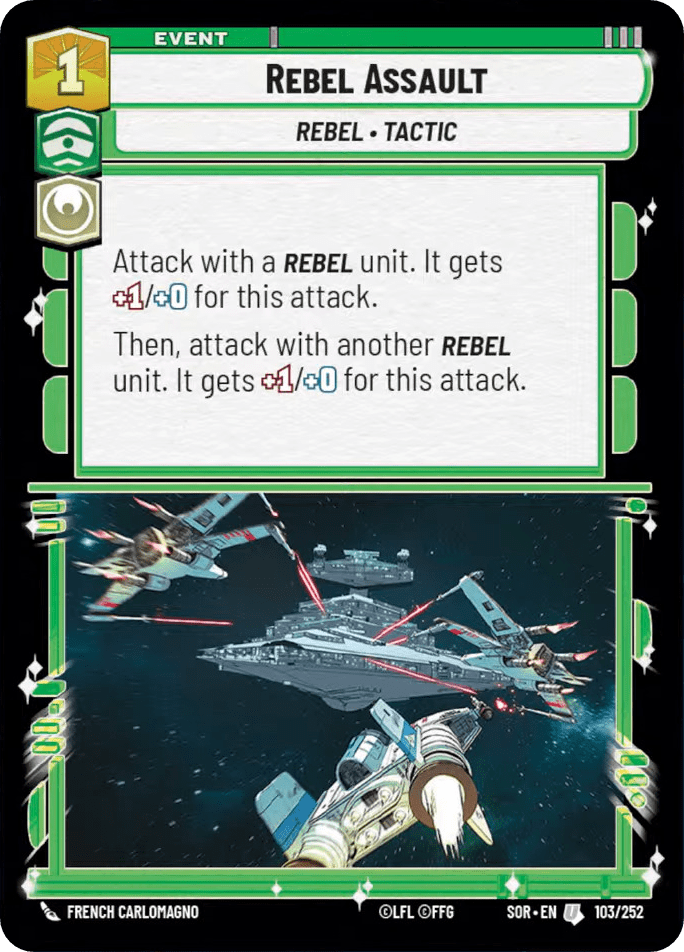 Tyler – Great card with a lot of general uses. Justin is absolutely right that Green Sabine MachineTM is coming for us. Unlike Yellow Sabine, that deck will have access to Energy Conversion Lab, the best base in the game. But Rebel Assault will have applications beyond aggro. Any deck with a combo-able “On Attack” ability will want to take advantage. Think attacking with Luke and shielding the 2nd attacking unit for a clean kill. Value!