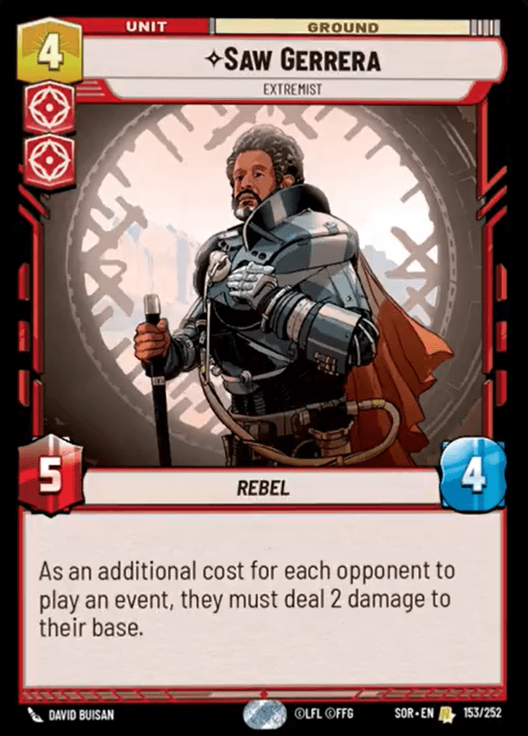 Justin – We got our last Double Aspect card as well! Love the art on Saw, and one of my favorite Star Wars characters of the last decade. An interesting ability with a decent statline of 5/4 at 4 resources definitely makes him playable in Double Aggression decks, but I’m still not sure what the best version of that will be. When you go Hero Double Aggression, you definitely want to play the Aggro archetype, but you end up hurting your best card (For a Cause I Believe in) because you can’t run enough hero cards to give it favorable hit rates. It’s likely Villain will run it best, which always makes me laugh seeing Saw and the partisans running alongside given their Imperial hate.
