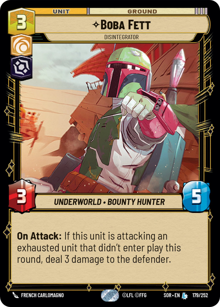 I have my eye on a few different ground units, but there’s really only one that I can’t find a lot of room to argue against or any real reason not to run in decks with its color- that’d be Boba Fett, Disintegrator, which, despite being pretty staunchly slanted towards control, is simply too strong to be left out of any Villain/Yellow list right now. He can be aggressive, or he can patiently pick off your opponent’s little guys without taking any damage back. He can Shoot First for insane reach, or ECL to get a huge board swing with no response available. Heck, sometimes he just gets rid of a shield before hitting a unit and that’s all you needed. He’s just stacked with stats and utility. He’s 3x… forever?