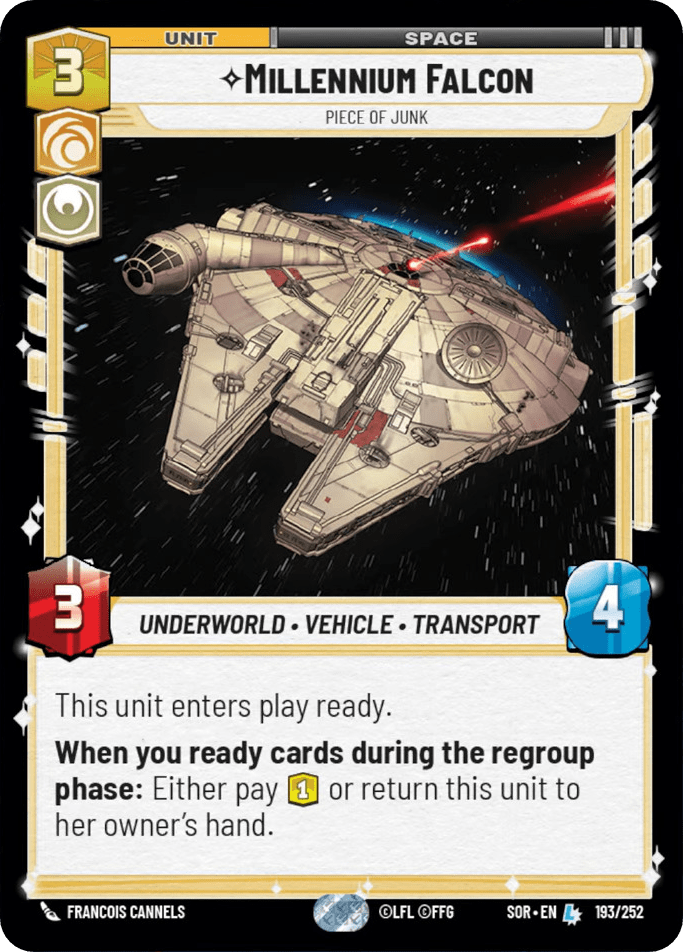Well, I feel the ground unit space is deeper, so I’m going to go ahead and pick what I view as the best space unit in the game, the Millennium Falcon. The only reason this card isn’t everywhere is because hero yellow has one of the worst card pools in the game. It’s so good at 3 and has a lot of flexibility.