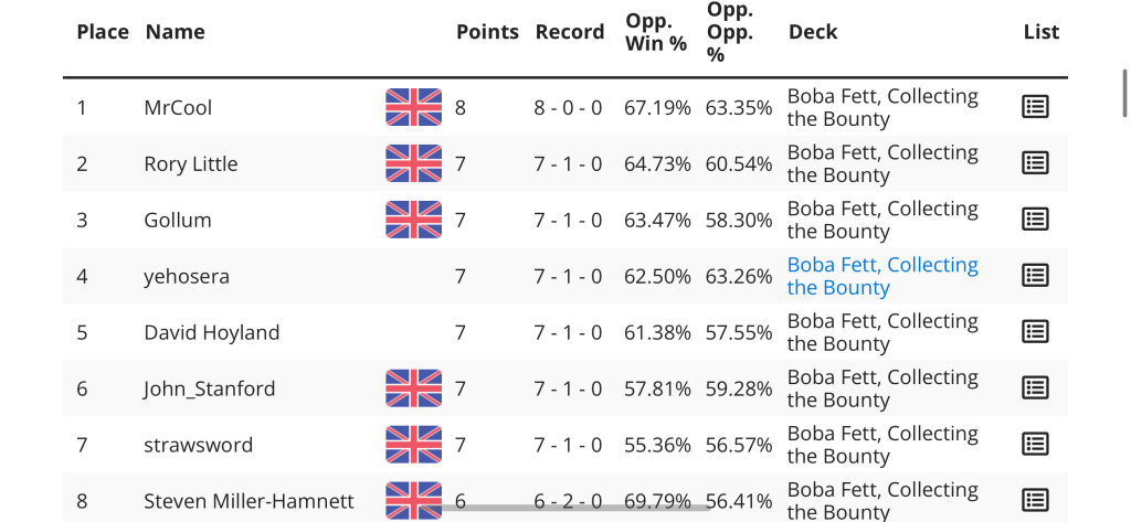 Across the channel this weekend, the French hosted their own 32-person SWU tournament with Vader/Green coming out on top. The tournament seems like more confirmation that we’re in a Boba/ECL/Superlaster Tech meta. Congrats to Pure Sabacc!