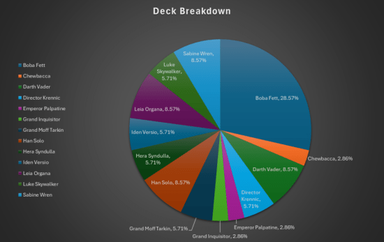 Our 3rd tournament of the week was in Washington state. The top 8 were 3x Boba/Green, Boba/Yellow, Iden/Green, Luke/Green, Sabine/Green, Vader/Blue. The finals was a Boba-on-Boba showdown. Unfortunately, at time of publication, we don’t have decklists for this event. If someone does, please reach out to us.