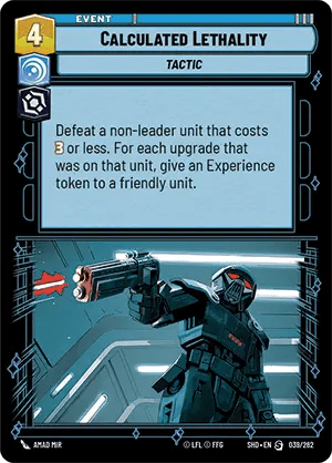 Justin – This somewhat teases at the potential of 3 cost or less leaders in the future given its non-leader tag. The 4 cost is steep outside of the blowout potential of hitting a heavily upgraded unit, so I’m not sure we’ll ever see this card beyond the side board unless we have a heavy Mandalorian upgrade meta. Dodge this!