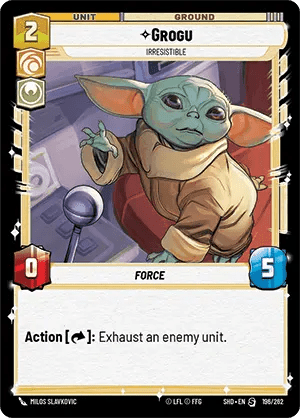 Tyler – This adorable guy fills a lot of deckbuilding holes I’ve been staring at. First, he’s a 2-drop Force unit who won’t immediately die so he can consistently enable Force cards in decks like Han/Red that lack enough Force units. Second, a 5-health Force unit round 1 could make for bonkers Jedi Lightsabers round 2. Oh, yeah and he’s got a great ability! Grogu and Mando could be the beginnings of a legit Hero control deck.