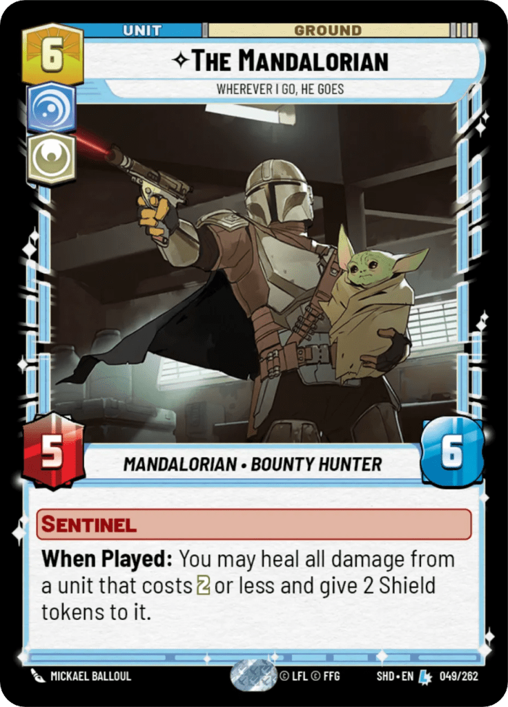 Jayson – I don’t know how good a blue deck that plays both this and Obi-Wan actually would be, but I sure do know playing into that does NOT sound like a fun time. I think this is super duper solid. Plus- pulling ol’ boy here with U-Wing and slapping him down with a 1 drop Blue or Green unit ought to be a riot. I love his stats, I love buffing little dudes, and thusly…I love the Mandalorian. Will be a very fun pull when we inevitably crack those sweet, sweet Shadows packs!