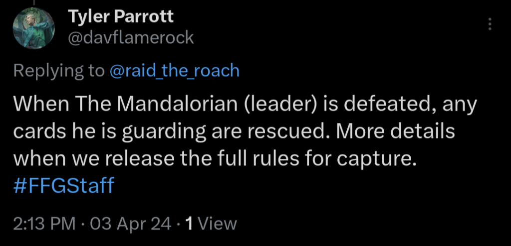 Justin – Just like Gideon’s ship above, I’m not sure there’s ever a world you play this without running the Mandalorian. Important to note the reminder text does not mean if you capture something with the Mando leader, it will never be returned since leaders don’t leave play. Choosing the time to play the Rifle will really change the value based on what you can capture and hopefully keep for a while!