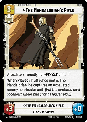 Tyler – Capture was an annoyingly effective mechanic in Legends of Runeterra, but in that game you couldn’t directly attack an opponent’s unit. Not sure if it will be as powerful in SWU. I’m kinda stunned this isn’t limited to the ground arena. My opponent plays a Star Destroyer and BOOM, gone. That said, this an expensive upgrade that doesn’t do much if we don’t have Mando out. Mando’s Rifle will be boom or bust depending on play and matchups.