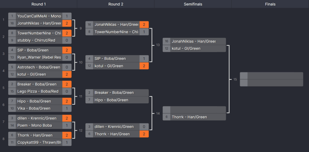 This week, the Top 16 for the March Season continued with strong showings from Han Green, and another spicy win by GI/Green over Boba/Green! The final semi-final spot is guaranteed to be filled by a Boba/Green, but we’re excited by the diversity of lists in this top-cut so far. Good luck to the remaining competitors!