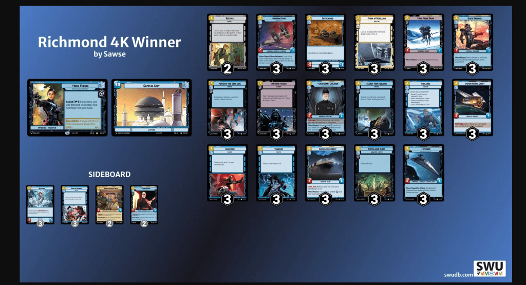 Don’t let the graphic below fool you, the Star City Games event in Richmond, VA this weekend was for four-thousand dollars and featured 128 players vying for the crown! The top 8 featured 2x Sabine/Green, 1x Mono Red Sabine, 1x Mono Blue Iden, 1x Vader/Green, 1x Han/Blue, 1x Luke/Green, and 1x Krennic/Green.