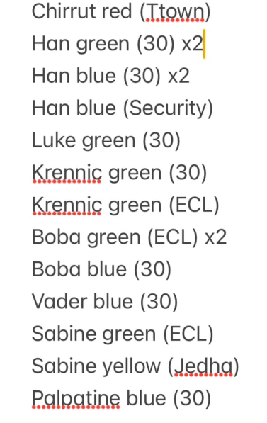 Second, a 2-case tournament for (future) cases of Shadows of the Galaxy at Mythic Games in the Littleton (Denver area) had 50 players. Top 8 was Sabine Yellow, 2x Sabine Green, Han Blue, Vader Blue, Leia Red, Iden Green, Boba Green. The cut did not use constructed, instead there was a draft – top seed was Jeff Creasy on his 6-0 Sabine Yellow. The Top8 round was played, but the Top 4 elected to split prizing.