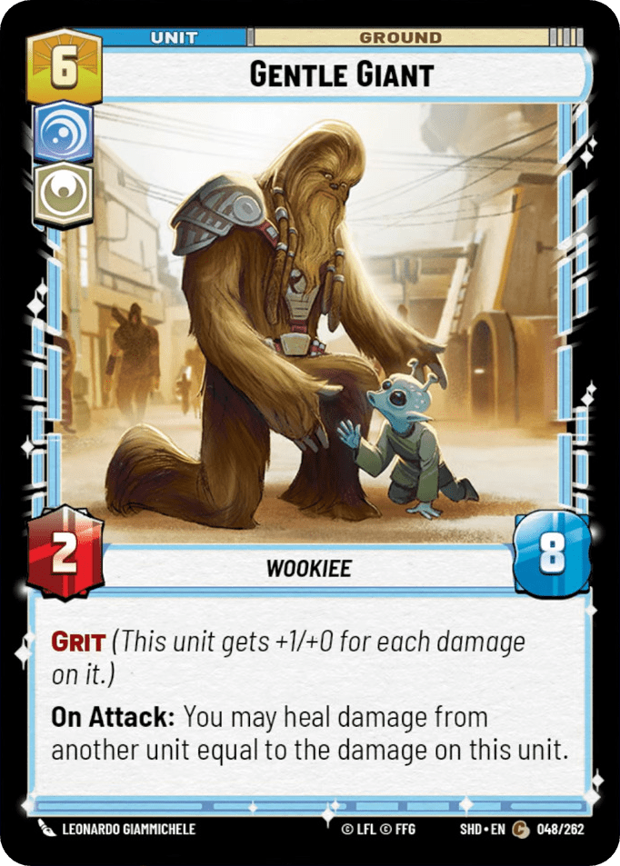 Justin – Interesting to note you can’t smuggle this unit in if you have no other units on the board. Since it isn’t in play when you’re paying the cost of deal 4 damage to a friendly unit, it can’t be smuggled in that situation. Outside of that, it’ll be interesting to see what kind of crazy combos we can do with giving our whole field grit.