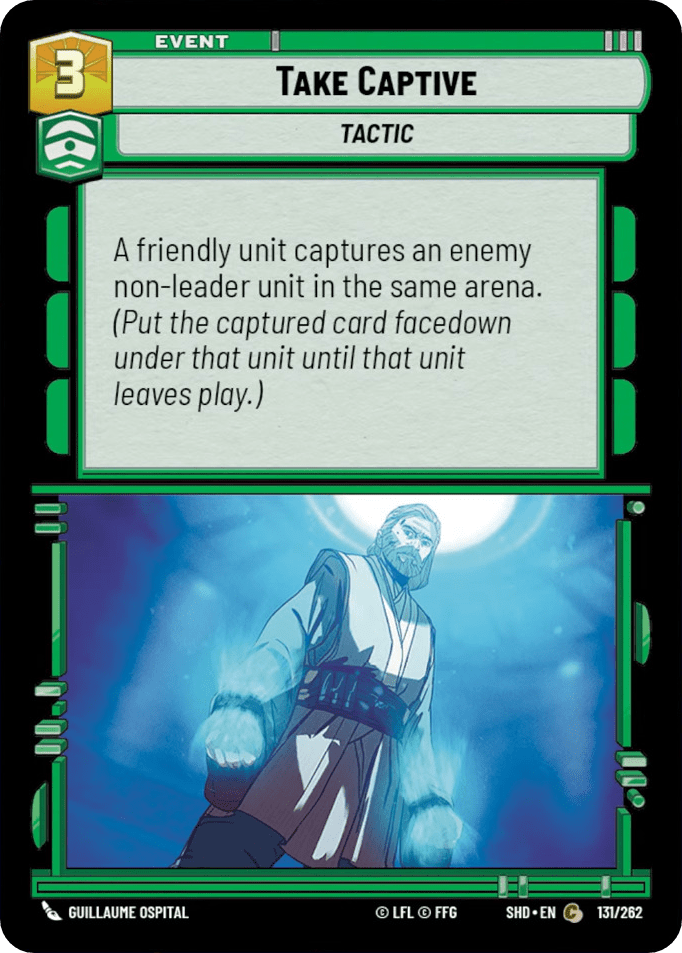 Justin – This feels like it will be one of the better capture cards. Since it can capture any non-leader unit in the same arena regardless of cost, you can easily lock down a lane with your Star Destroyer or big ground unit with this card.
