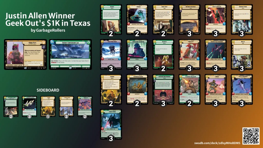 Good morning! In case you weren’t around and missed our Meta Monday recap, we played in a $1K this past weekend in Burleson, TX (DFW) where I was able to take the win with Boba Command! The following is a discussion of the list, why I chose it, and a recap of each round as best I remember it. I intended to write this Sunday while everything was as fresh as it could be, but I crashed pretty hard that day.