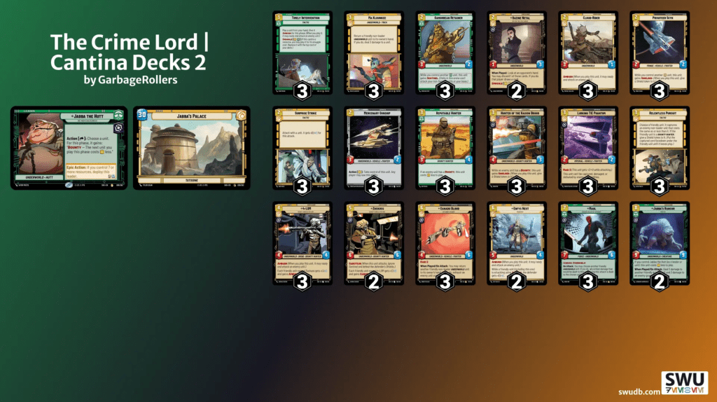 So to that end, we’ve got a lot of stuff that’s good at doing just that. Jabba can spit out bounties on demand for free, which makes early curve units like Reputable Hunter and Hunter of the Haxion Brood absolute no brainer slam dunks for him. We have early trading pieces like Gamorrean Retainer and Mercenary Gunship. And our bevy of Ambush units alongside Ma Klounkee will help us stay ahead long enough for Jabba to unleash his very potent capture effect. Closing out are Maul and Rancor, and all of this combines into a very cohesive gameplan that knows what it wants to do at every stage of the game. Not bad for a deck that currently runs just $61 on TCGPlayer. It’s almost like the Crime Lord planned it this way…