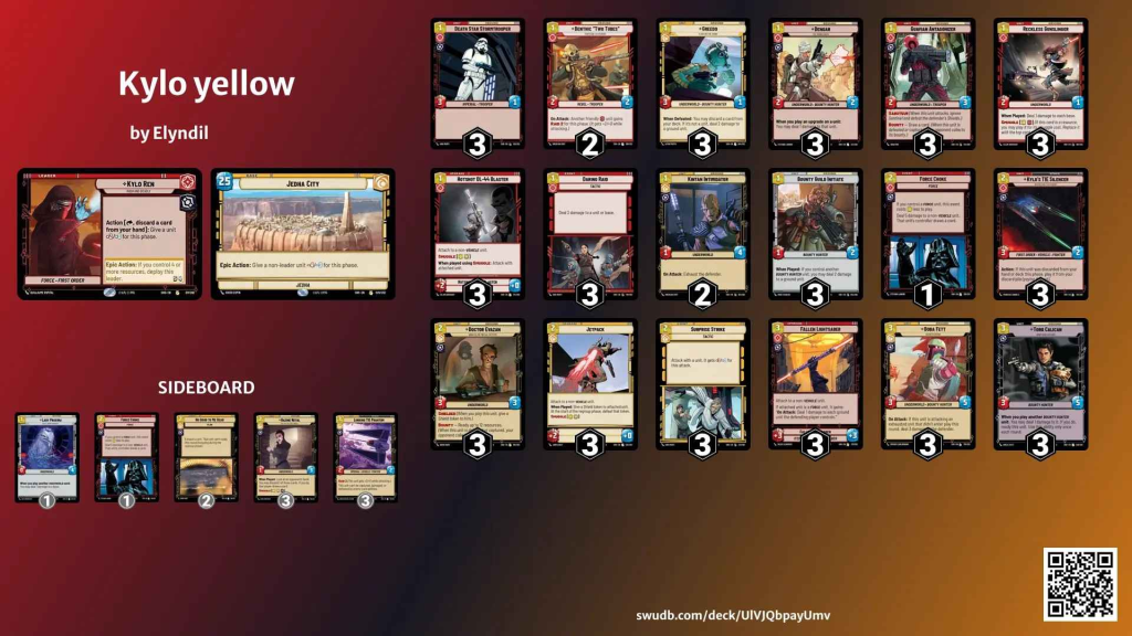 Third, we have a late addition to the aggro lane: Kylo/Yellow. This deck took 1st this week in a Pittsburgh 1K and has the kind of YOLO game plan you need to out-aggro Sabine. It was lurking at the top GenCon tables and stealing games with its plan to load up Toro Calican with upgrades. It’s fun to see new leaders and archetypes coming to the top!