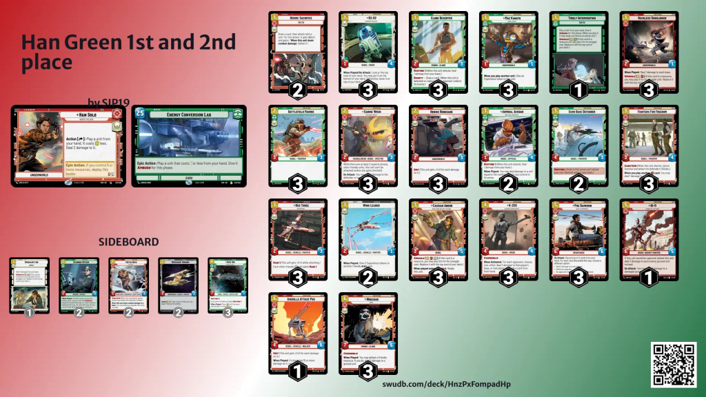 Han2/Green is a deck we initially had on our snapshot at Shadows of the Galaxy release, but eventually dropped due to its absence from the meta. That original build was focused on going tall with Han and ramping quickly to large units like Krayt Dragon. It never quite made it into the meta, and that build has now migrated to a Blue-based build using hand disruption tricks. The build we’re adding today takes a different tack by using Han’s unit side to swarm the board by playing large volumes of 1-2 cost units.