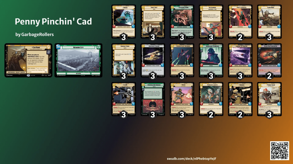 Here at GarbageRollers HQ, we try hard to be an institution for the people and by the people. Our Meta Snapshot looks to get you up to speed with the competitive scene with clarity and brevity. Our New Player Guide is designed to be the best first stop for fresh players. And the first and second articles in our Cantina Decks series present sets of approachable decks that are aimed at the budget-conscious player.