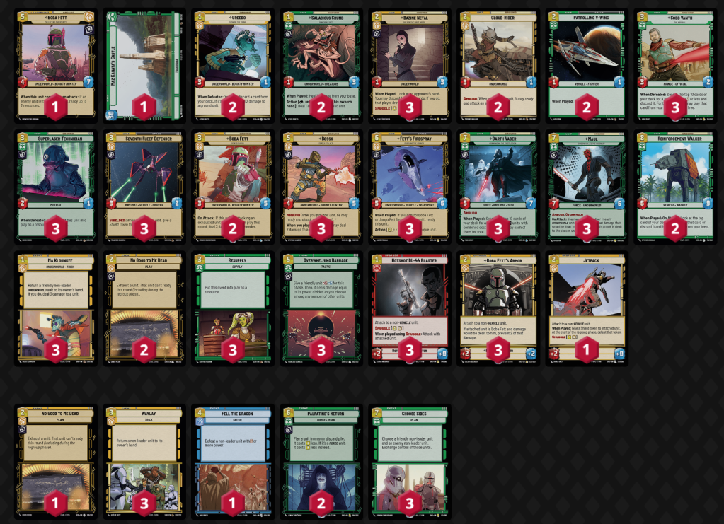 Vader/Green has underperformed the meta now for about a month and has not shown the same potential as other decks in its class- namely Bossk/Green and Palpatine. As such, we’re removing it from our meta snapshot until it regains playrate and achieves meta success.