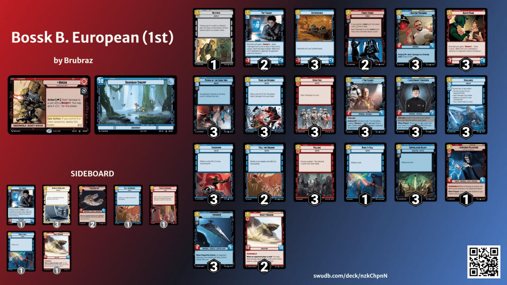 Bossk/Blue won a major tournament this weekend in Spain. This deck is claiming the Blue/Red hard control mantle that Vader/Blue carried to major victories in Set 1. With its potent ability to heal and draw cards via Bossk’s doubling ability, we suspect this version will be a force at least until set 3 drops.