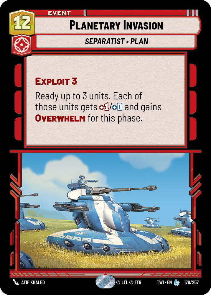 Exploit – The Exploit keyword allows a player to sacrifice a unit they control to discount the cost of a unit by 2. Since the designers assumed a cost of 1 for producing a Battle Droid token, the basic math was that each instance of Exploit would reduce the total cost to play a unit by 1. To keep Exploit units from being broken, they adjusted the printed cost of the cards up. Put another way, each digit of Exploit on a card will raise its printed cost by 1. This is a classic risk/reward mechanic: if you have the cheap units to sacrifice, you’ll get something under-curve; if you don’t, you’ll be overpaying for those units.