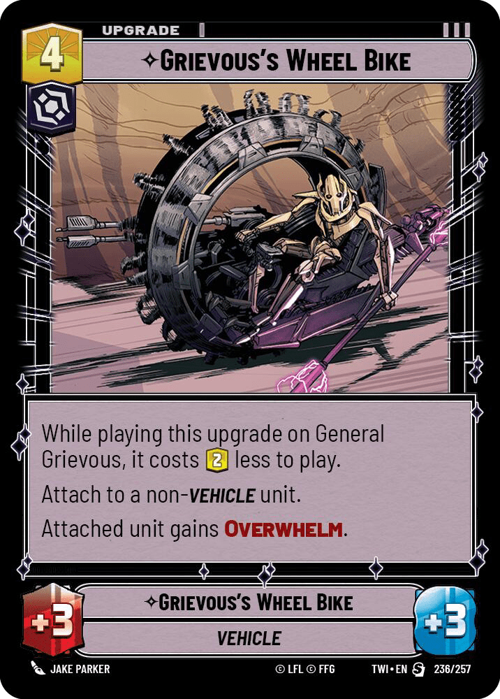 This one is pretty straightforward. Provided you can get this upgrade down on General Grevious (leader or unit), it’s providing you 3-cost worth of upgrade power for only 2 cost.