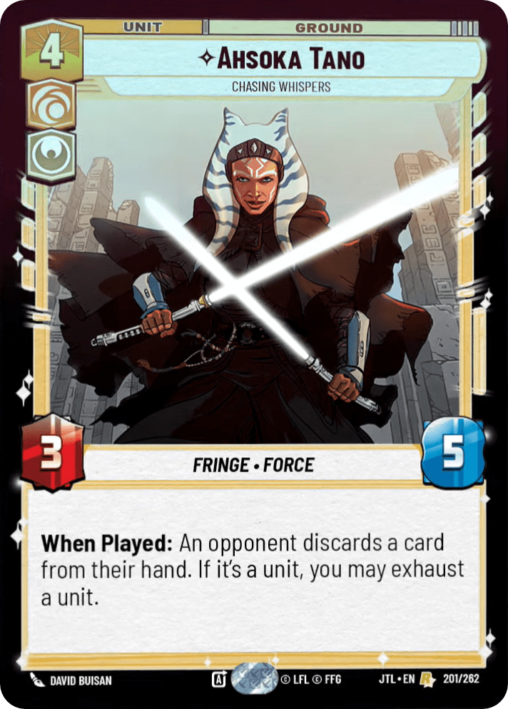 Ahsoka – I think she’s cracked! 4 cost is right at the point where you really want some kind of instant payoff upon entry so that your investment is not totally invalidated by value trades. Not only does this effect give you that instant, tangible payoff, it’s justttt the right amount of impact to where you don’t have to pay for it too bad on Ashoka’s stats. On top of that, the Force trait and color slots her right into an existing Red/Yellow Hero shell that was already successfully attacking hands and utilizing Force Throw. Ahsoka ticks all the boxes and is guaranteed to play a meaningful role in her decks.