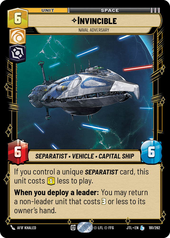 Justin – There’s definitely spicy implications of running this with Admiral Trench (it is his ship after all), but I’m definitely most excited about the power of being able to treat this as a 5 cost unit at any time if you’re leader is Separatist! This should allow you to get it out on 5 resources often before you deploy Trench at 6 to take advantage of the ability. The Triple Dark Raid Separatist deck is really starting to come together with this and the new Invisible Hand!
