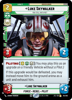 Justin— My first pick is purely a value pick. I’m going with Luke Skywalker, You Still With Me?. A 3/2 upgrade for 2 is already above curve, then we add in the bonus of it deploys as a unit when defeated? Value town baby!