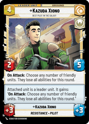 Justin— With my first pick of Round 2, I’m going to take my boy Kazuda Xiono. Ramp and effects that break the game generally are some of the stronger effects in a TCG, and Kaz somewhat does both allowing units that were overstatted due to negative abilities by turning off the negative ability. What may be busted is how he breaks the negative effects on pump cards like Heroic Sacrifice and Trench Run. Kaz will only get better as we see more cards hit that play well into his ability. And that’s not even mentioning he’s another 4 deploy leader!