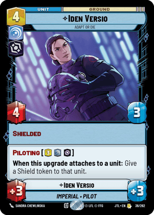Mike — With my third pick, I’m keeping it in the Vigilance Shielded family and taking Iden Versio, Adapt or Die and I’ll leave the choice up to her, I’ll follow her as far as she’ll let me and she can end me when she’s done with me. I never knew I needed a 4/3 Shielded 4 drop in my life, but she has done so much work in the early testing for this set both in the ground arena, and shielding up a space vehicle to create a ridiculous unkillable bomb that has my opponents ready to flip the table. Plus, her interaction with Corvus picking her up and letting her shield it is just some of the most fun and spot on design this game has seen, and they’ve been pretty great at nailing the feel of Star Wars and how it translates to gameplay, this card is 10/10 perfect design.