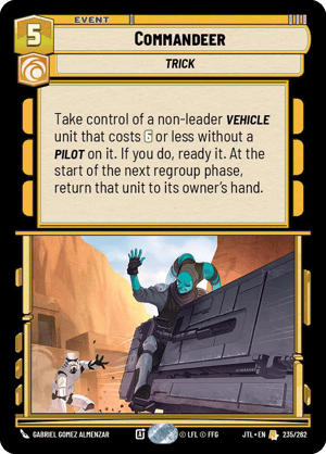 wooooo — Well, I went with a lot of cards that are good in Jango, so I may pick one that’s actually good against him. I’m going with Commandeer. While I think this card may ebb and flow out of metagames during its lifespan, the fact of the matter is that currently, against what is widely perceived to be the best deck going in to set 4, it’s a standout. I can see this card being in a lot of yellow decks moving forward due to it’s power level against things such as War Juggernaut, Ruthless Raider, and other stand out ships. It’s a shame though, that once again, yellow gets all the answers.